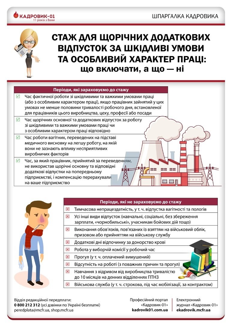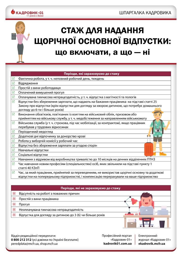 Скачайте шпаргалки, щоб завжди «мати під рукою» інформацію про те, які періоди включати, а які — ні, до стажу для надання щорічних основної та додаткових відпсток.