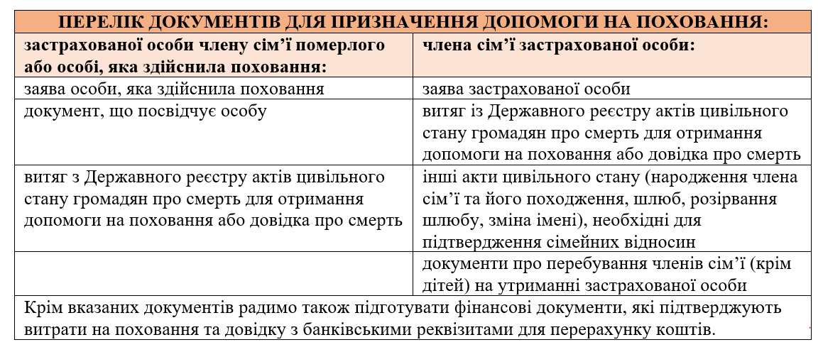 Допомога на поховання в Україні надається у разі смерті застрахованої особи або членів сім’ї, які перебували на її утриманні (ст. 20 Закону № 1105).