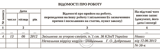 Запис про звільнення за угодою сторін в трудовій книжці