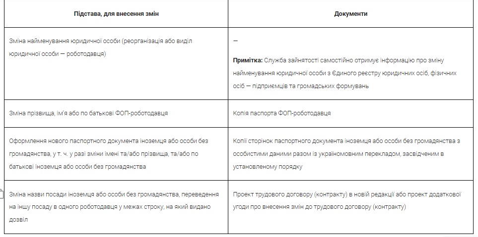 За потреби внесення змін до дозволу на працевлаштування іноземців, роботодавець має подати заяву про внесення змін до дозволу на застосування праці іноземців та осіб без громадянства (далі — заява) та документи залежно від обставин звернення.