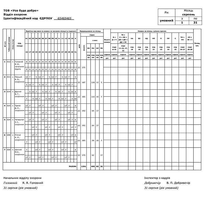 При заповненні табеля за поточний місяць не слід забувати про робочі години, які переходять з попереднього місяця, тобто відпрацьовані години зміни, що почалася в останній день попереднього місяця. У нашому прикладі це робочі години охоронника Шостого М. Н. з 00:00 до 7:00 1 серпня.