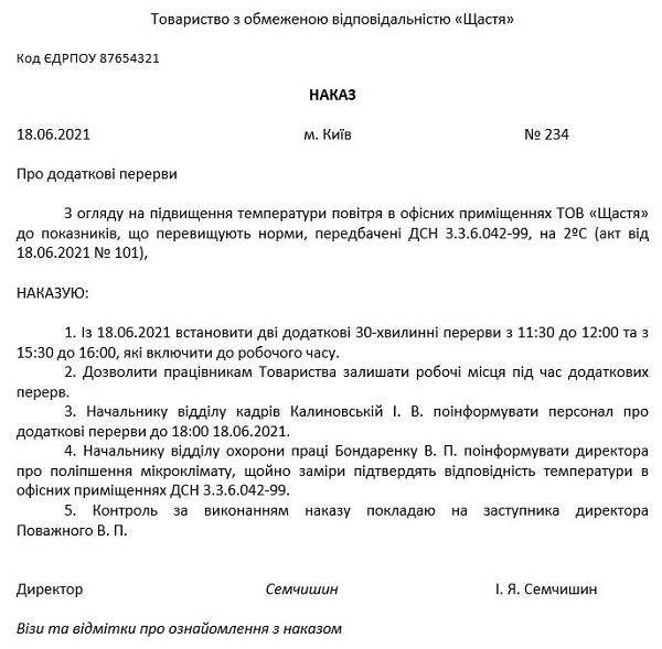 Додаткові перерви вводьте наказом з основної діяльності. Ознайомте з наказом усіх працівників підприємства. Для зручності скачайте зразок.