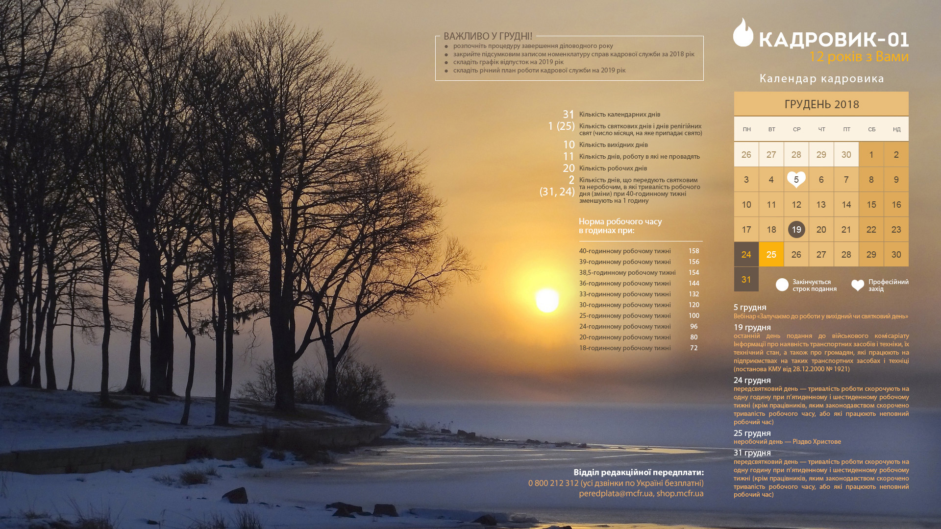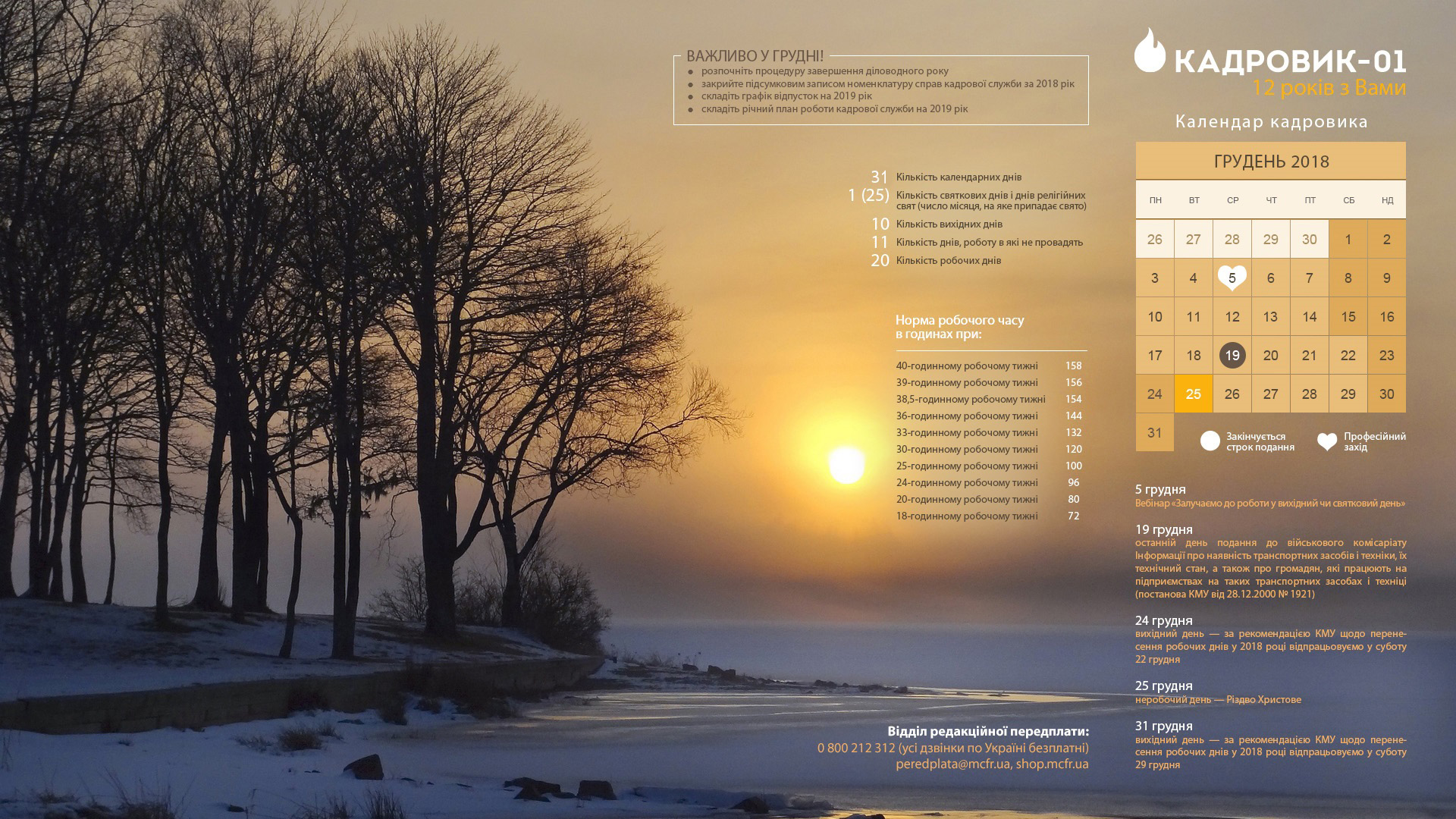 Календар на грудень 2018-го з урахуванням перенесених робочих днів