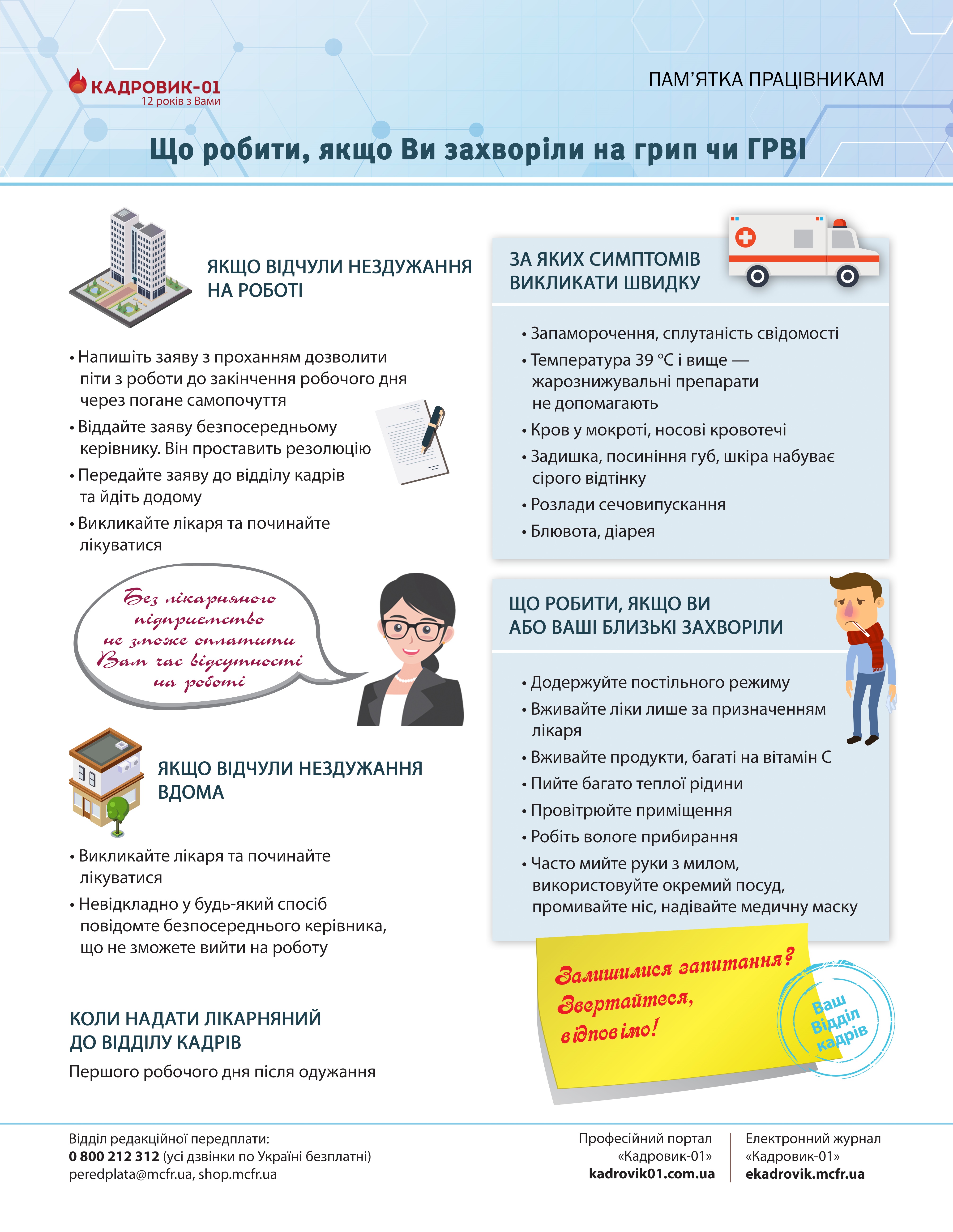 Розмістить кольорову Пам’ятку працівникам «Що робити, якщо Ви захворіли на грип чи ГРВІ» у вестибюлі, на корпоративному сайті, зробіть розсилку працівникам електронною поштою.