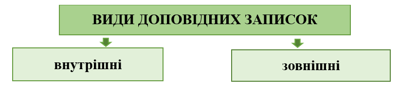 Доповідна записка зовнішня: текст доповідної записки поділяють на дві частини — констатуючу та заключну. Приміром, таку записку пишуть з метою вчасно поінформувати начальника вищої інстанції про події, що впливають на сталість системи менеджменту на підприємстві.