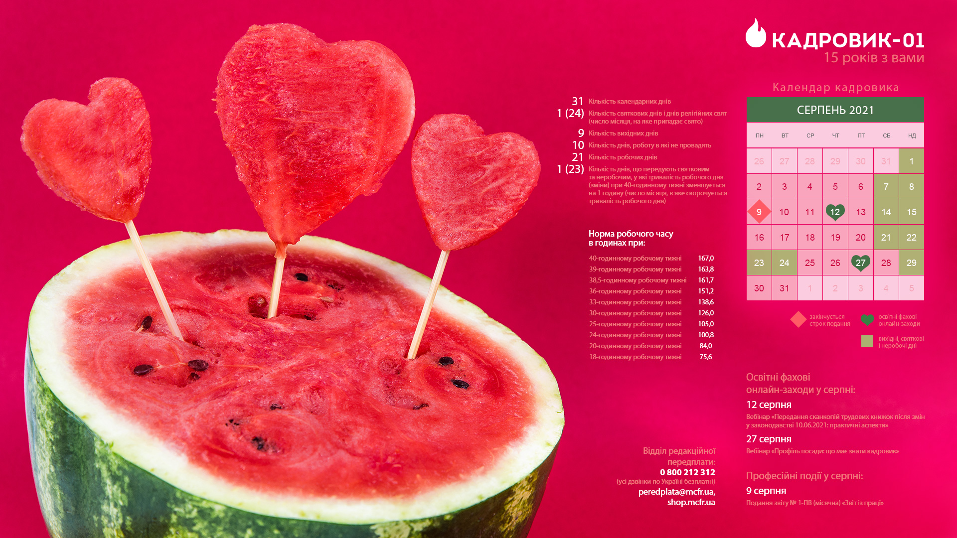 Кількість днів, що передують святковим та неробочим, у які тривалість робочого дня (зміни) при 40–годинному тижні зменшується на 1 годину (число місяця, в яке скорочується тривалість робочого дня) | 1 |