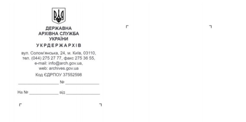 Зображення Державного герба України на кутових бланках розміщуйте на верхньому полі над серединою рядків із найменуванням юридичної особи, а на поздовжніх — у центрі верхнього поля. Розмір зображення: висота — 17 мм, ширина — 12 мм.