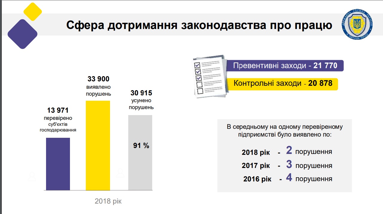 За 2018-й Держпраці перевірила майже 14 тис. підприємств, на яких виявила близько 34 тис. порушень. Майже 31 тис. порушень — було усунено.