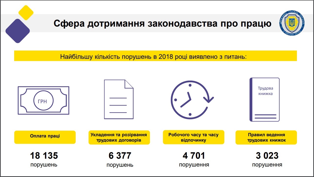 Найбільшу кількість порушень —18 135 — виявлено в сфері оплати праці. Втричі менше — 6377 — при укладенні та розірванні трудових договорів. Порушили режим робочого часу та час відпочинку — 4701 раз, а правила ведення трудових книжок — 3023 рази.