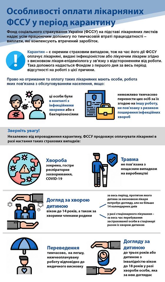 У випадках встановлення лікарем закладу охорони здоров’я тимчасової непрацездатності, зокрема, при виявлені симптомів гострого респіраторного захворювання, підозрі чи діагностування COVID-19, Фонд соціального страхування України профінансує надання допомоги за лікарняними листками, яка компенсує застрахованій особі втрачений за час лікування заробіток.