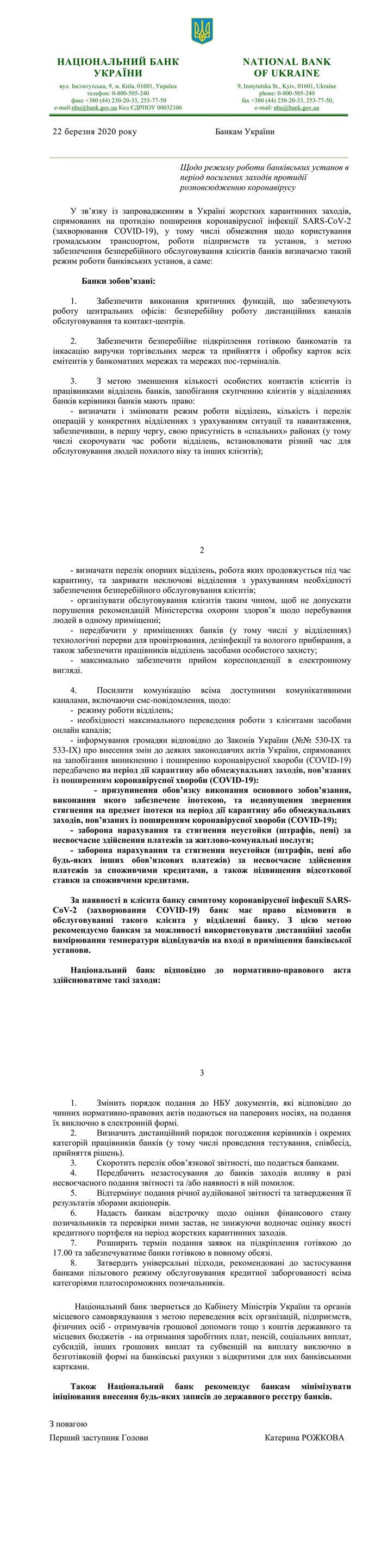 Відповідно до листа банки мають забезпечити безперебійну роботу центральних офісів, дистанційних каналів обслуговування та контакт-центрів.