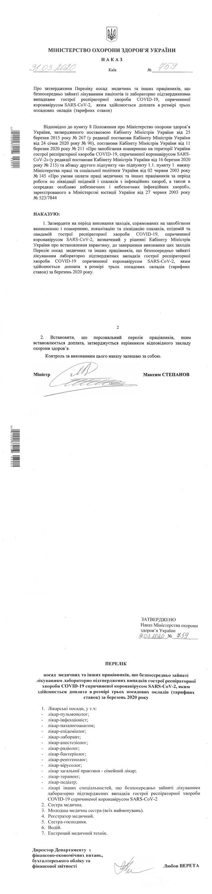 МОЗ наказом від 31.03.2020 № 759 затвердив перелік посад медичних працівників, яким з березня 2020 року мають виплатити доплату: