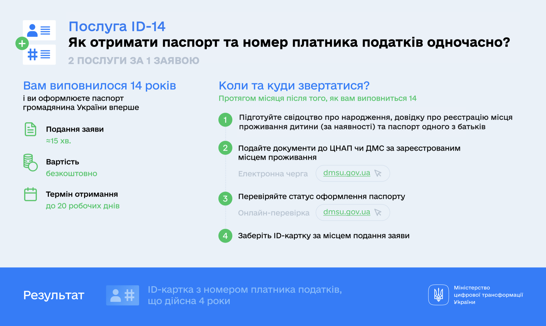 «Послуга ID-14 надається абсолютно безкоштовно при оформленні першого паспорта. Отримати її можна в усіх відділах ДМС України, мережі центрів «Паспортний сервіс» та деяких ЦНАП, що надають паспортні послуги. За 20 днів дитина зможе отримати ID-картку з номером платника податків, що дійсна чотири роки. Номер платника податків не змінюється», — додав очільник Державної міграційної служби Максим Соколюк.