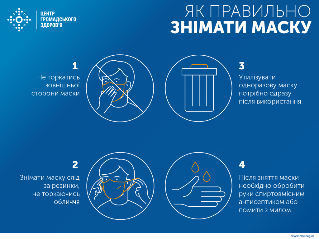Пам'ятайте, що руки забруднені і ними не можна торкатись обличчя, особливо очей, рота і носа. За першої ж можливості, обробіть руки дезінфектором із вмістом спирту не менше 60% або вимийте водою з милом протягом 20-40.