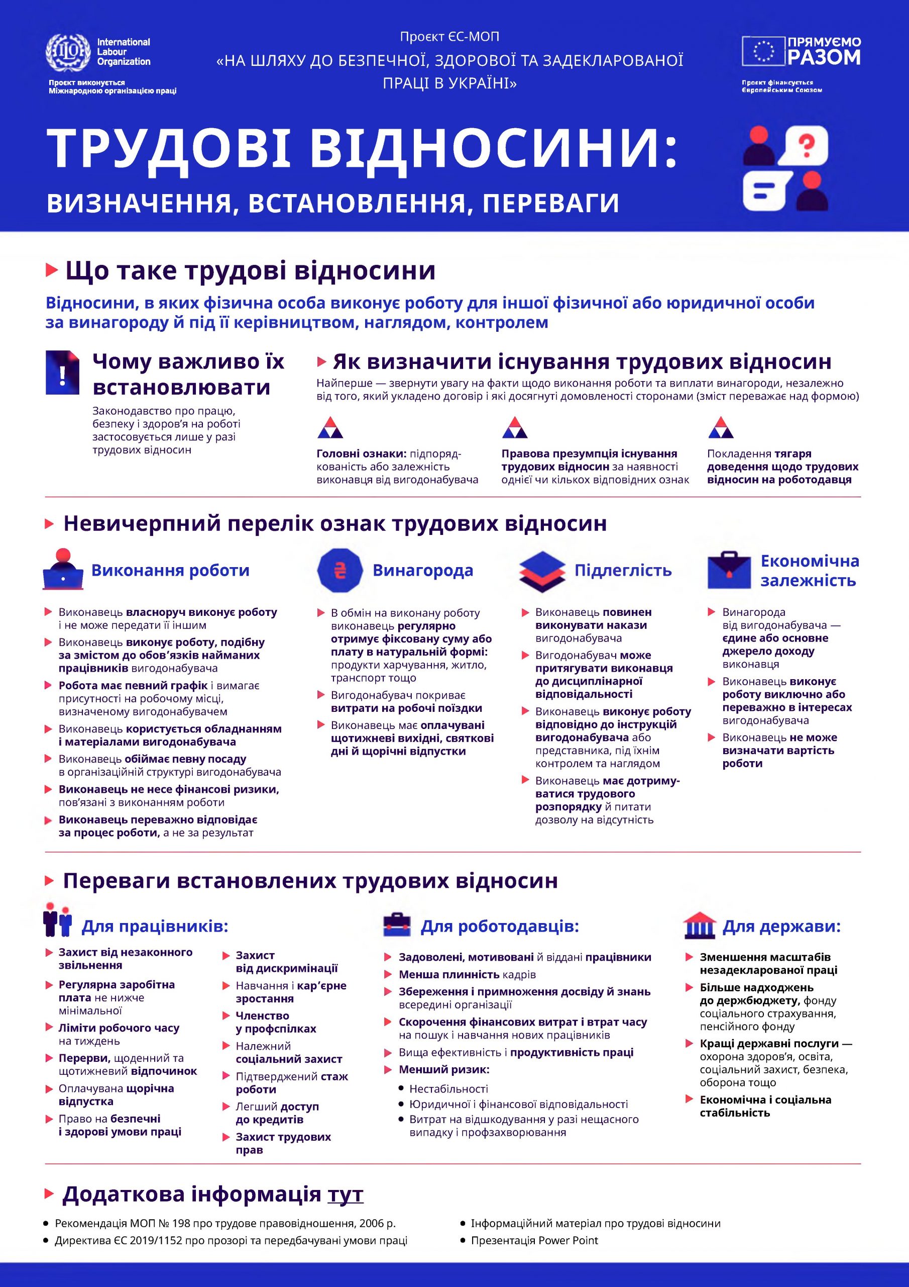 Міжнародна організація праці в рамках проєкту ЄС-МОП «На шляху до безпечної, здорової та задекларованої праці в Україні» створила інфографіку «ТРУДОВІ ВІДНОСИНИ: ВИЗНАЧЕННЯ, ВСТАНОВЛЕННЯ, ПЕРЕВАГИ».