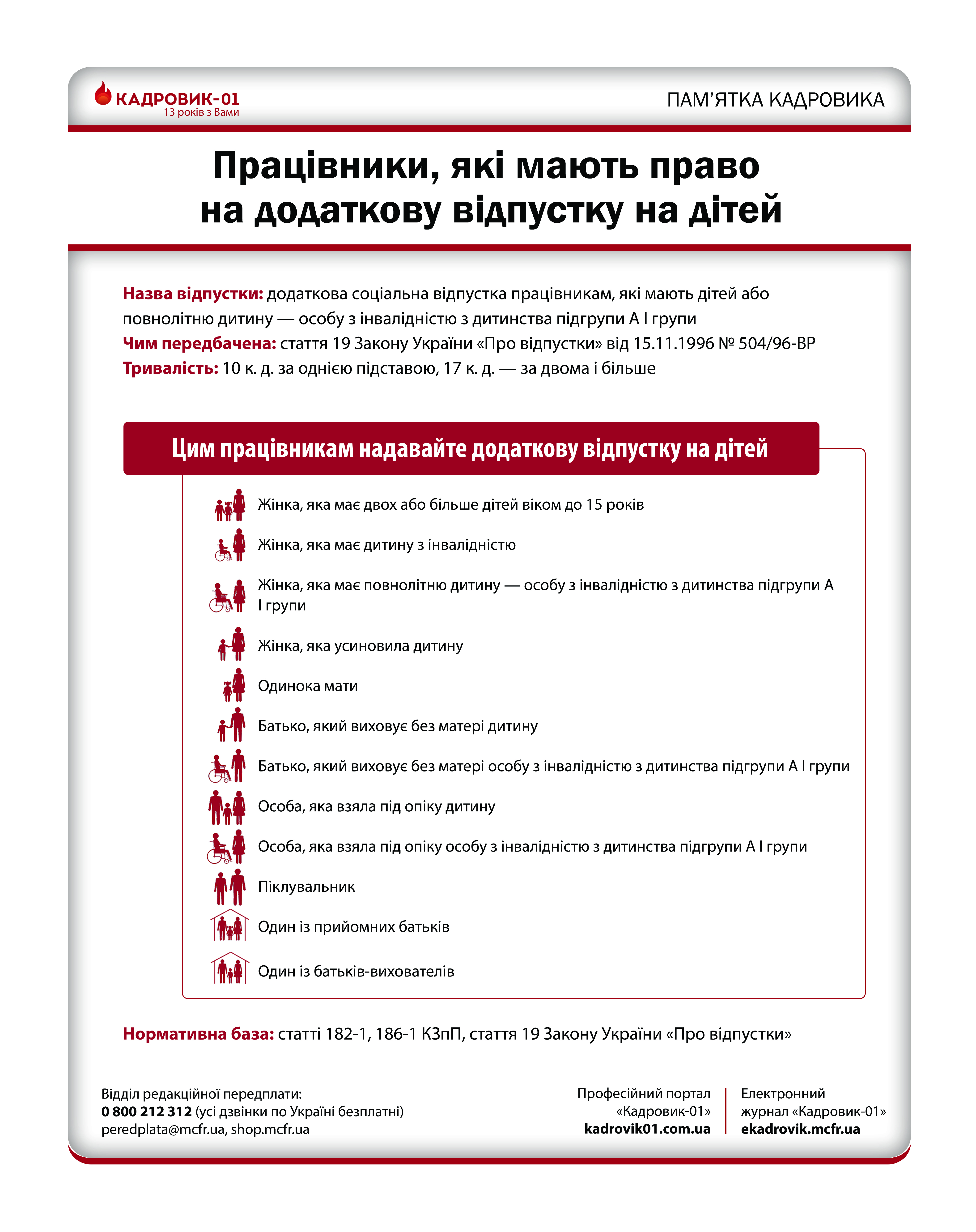 ГУ Держпраці в Одеській області нагадує, що одинокій матері надають щорічно додаткову оплачувану відпустку тривалістю 10 календарних днів відповідно до ч. 1 ст. 19 Закону України «Про відпустки» від 15.11.1996 № 504/96-ВР.