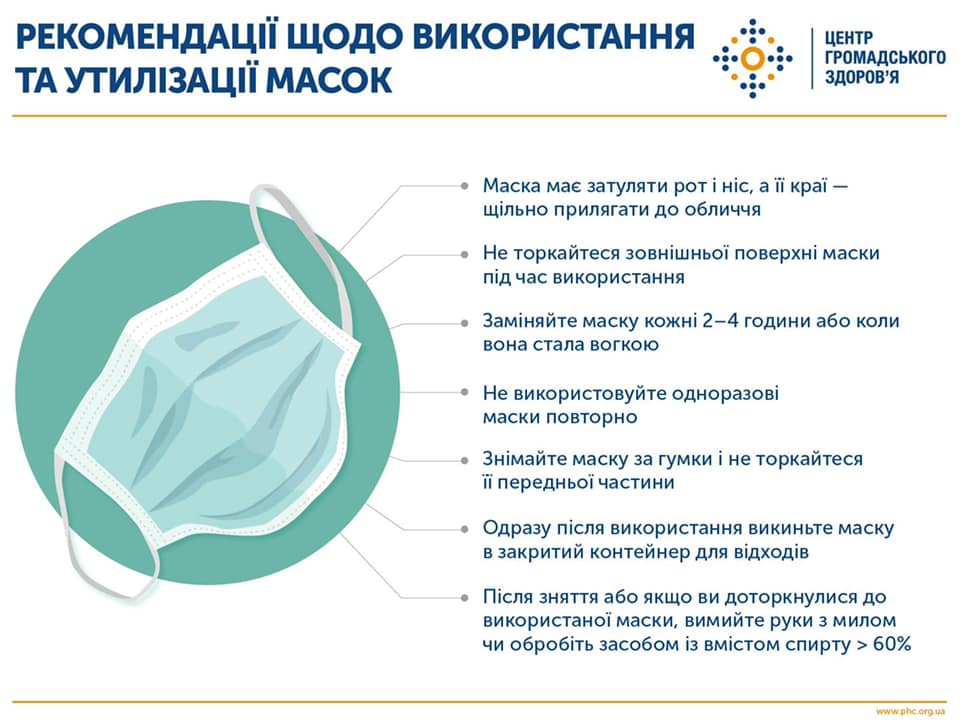 - чіпати зовнішню частину маски руками (Якщо доторкнулися, помийте руки з милом чи обробіть спиртовмісним антисептиком);