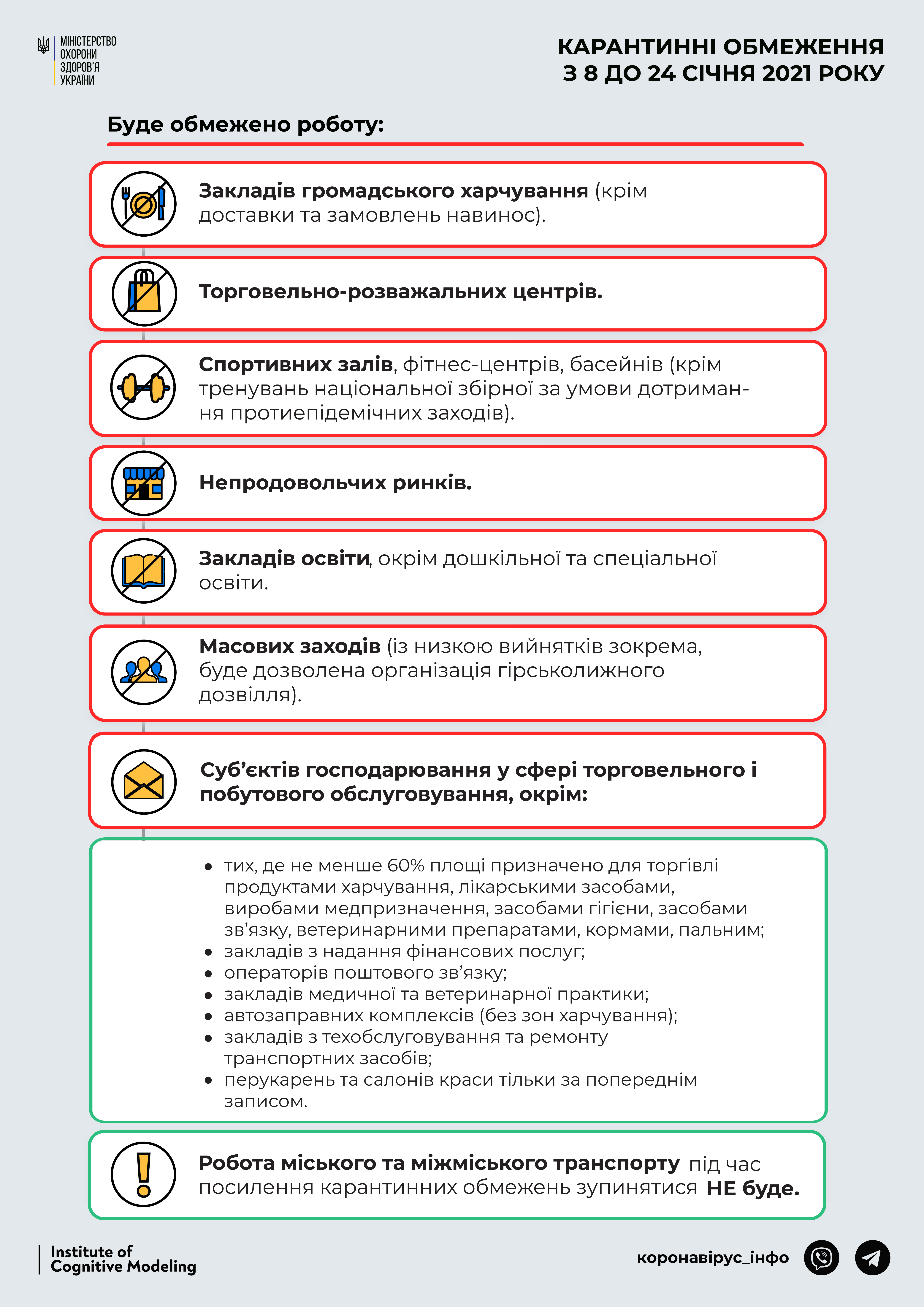 Як ми вже повідомляли раніше, на період з 00:00 годин 8 січня до 00:00 годин 25 січня буде запроваджено посилений карантин, який передбачає наступні обмеження роботи: