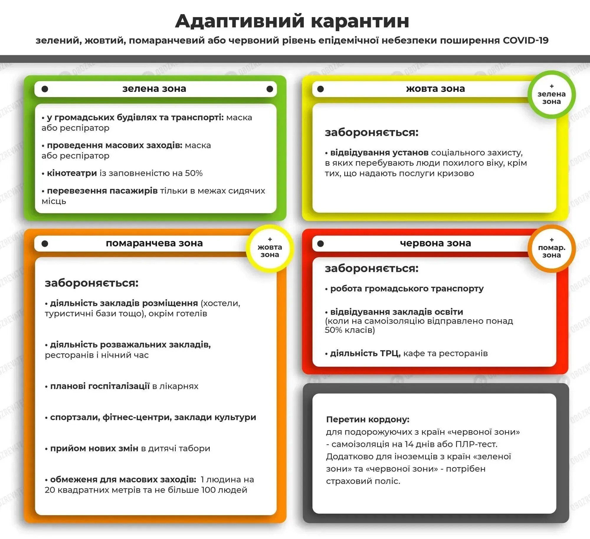 "Україна повернеться до моделі адаптивного карантину. В областях встановлюватимуться різні карантинні обмеження залежно від епідемічної ситуації. Як і минулого разу, передбачається чотири рівні епідемічної небезпеки, кожен із яких має чіткі обмеження та критерії визначення", – наголосив Денис Шмигаль.