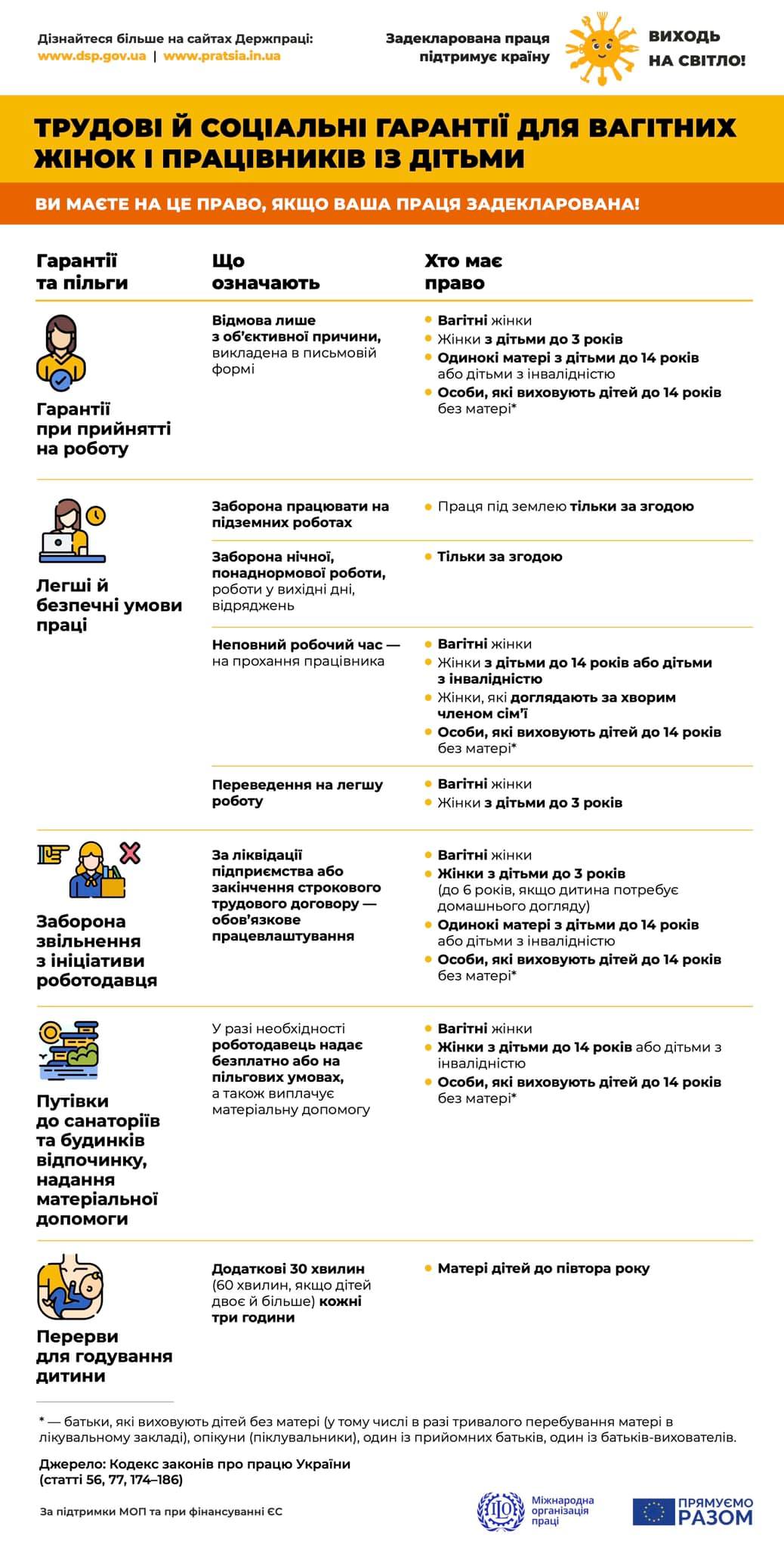 Вагітні жінки та працівники з дітьми в Україні мають певні трудові та соціальні гарантії. Щоб працівники пам’ятали про свої права, а роботодавці дотримали вимог законодавства, Держпраці створила корисну інфографіку щодо трудових та соціальних гарантій для вагітних жінок та працівників з дітьми.
