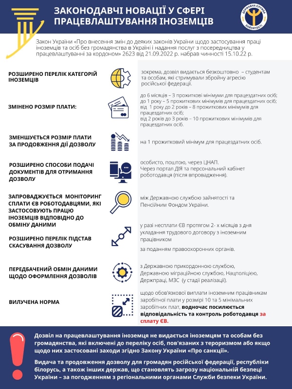 - розширив коло іноземців, яким безплатно видають дозвіл на працевлаштування (ч. 4 ст. 42-4 Закону України «Про зайнятість населення»); ідеться, зокрема, про студентів та осіб, які стримували збройну агресію Російської Федерації;
