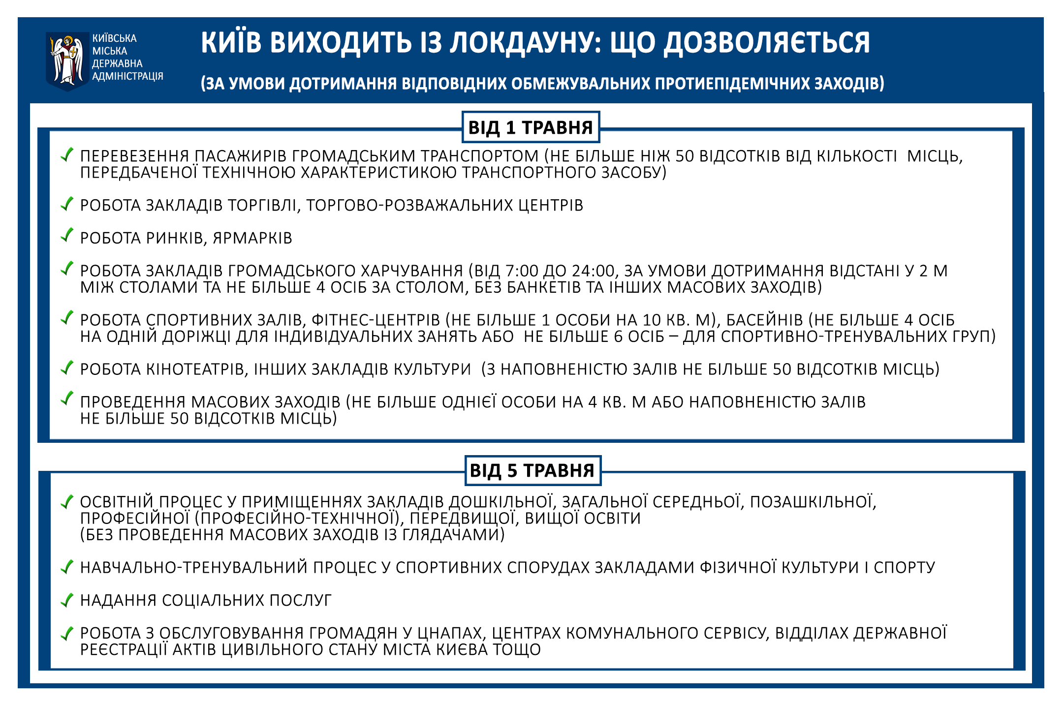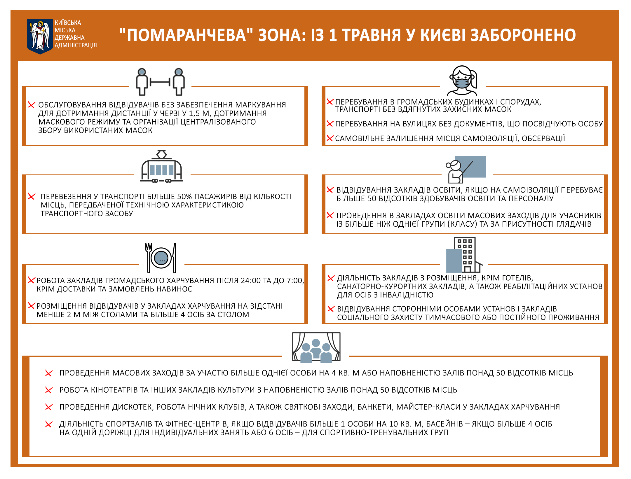 Відповідно до рішення Держкомісії НС, із 1 травня у Києві скасовано «червоний» рівень епідемічної небезпеки. Для забезпечення обмежувальних заходів, що відповідають «помаранчевому» рівню епіднебезпеки, із 00:00 1 травня на території міста Києва діятиме низка заборон. Вони зафіксовані у протоколі № 5 засідання штабу із ліквідації наслідків надзвичайної ситуації.