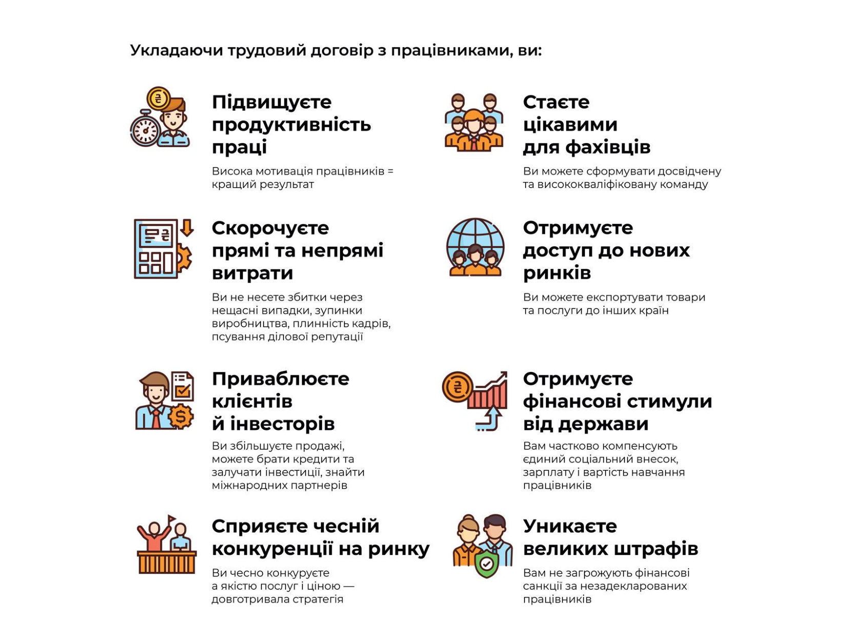 Продуктивність праці | Задекларовані працівники задоволені та мотивовані. Вони працюють краще, рідше змінюють роботу, більш ініціативні, ніж незадекларовані працівники |