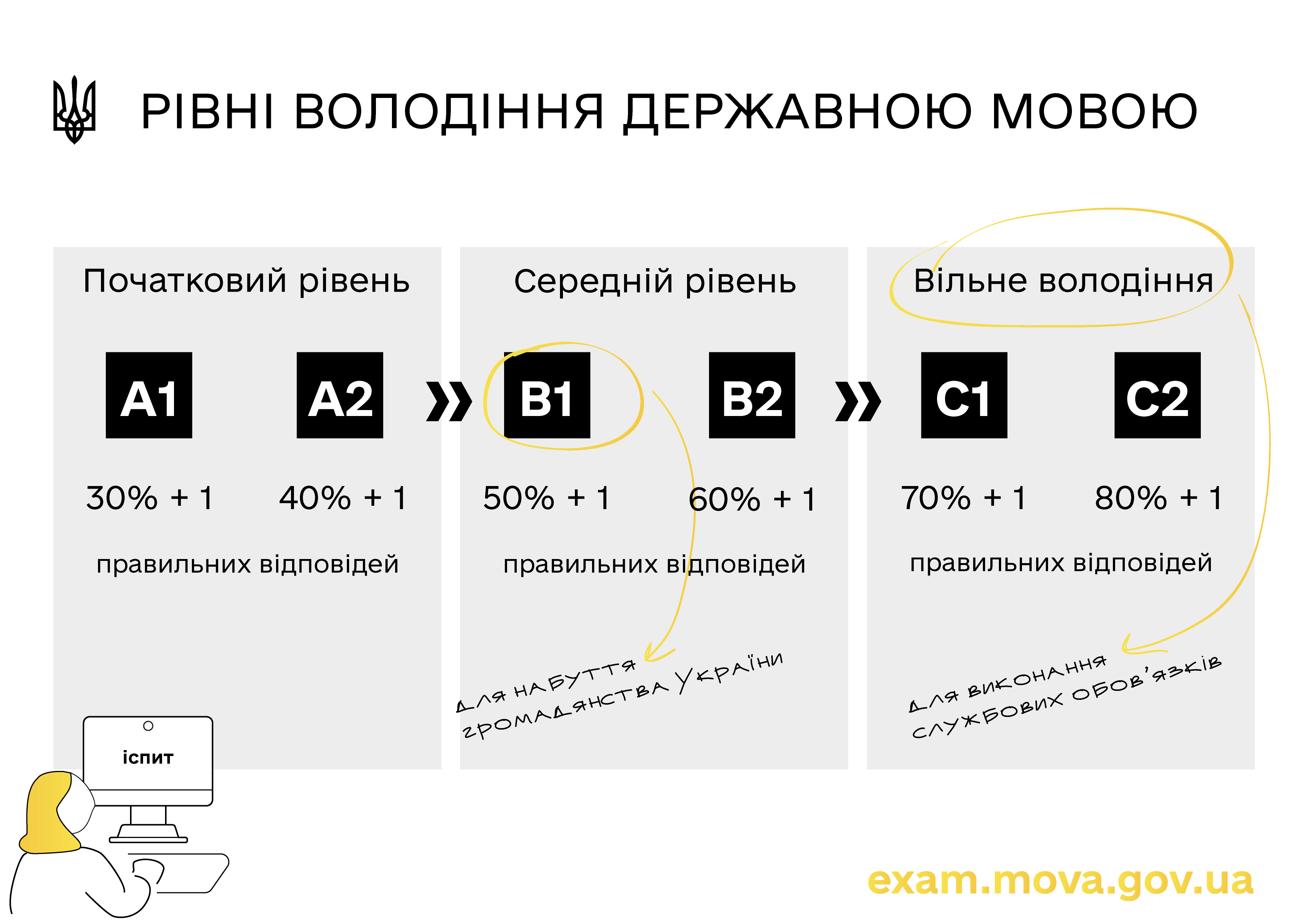 Відповідно до Поряду перевірки рівня володіння державною мовою, єдиних вимог до процедури проведення іспитів та критеріїв оцінювання, затвердженого рішенням Нацкомісії зі стандартів державної мови 13 травня 2021 р. за № 20, рівень володіння державною мовою визначають на основі підрахунку балів за письмову та усну частини та перетворення їх у відсотки від 0 % до 100 %.
