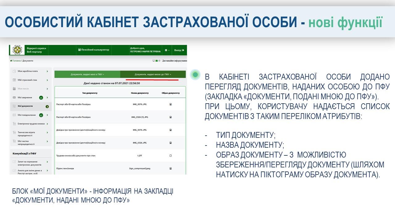 - додано перегляд поданих документів, у закладці «документи, подані мною до Пенсійного фонду України». При цьому, користувачу надається список документів з таким переліком атрибутів: тип документу, назва документу, образ документу – з можливістю збереження та перегляду документу, шляхом натиску на піктограму образу документа.