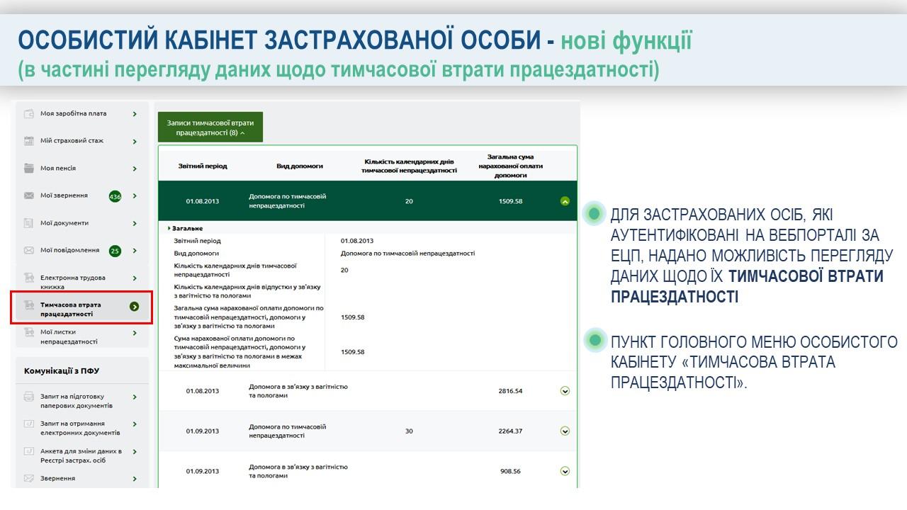Застрахованим особам, які аутентифіковані на вебпорталі за ЕЦП, надається можливість переглянути дані щодо їх тимчасової втрати працездатності – пункт головного меню особистого кабінету «Тимчасова втрата працездатності».