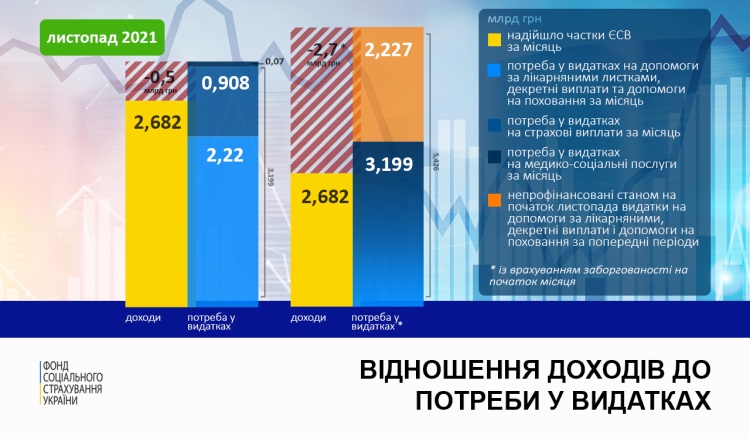 За підсумками листопада 2021 року на рахунок ФСС надійшло 2,682 мільярда гривень частки ЄСВ. Потреба у видатках на допомоги і страхові виплати без врахування адмінвидатків за цей же період склала 5,426 млрд гривень, враховуючи заборгованість з фінансування лікарняних, декретних і допомог на поховання, що накопичилась на початок місяця.