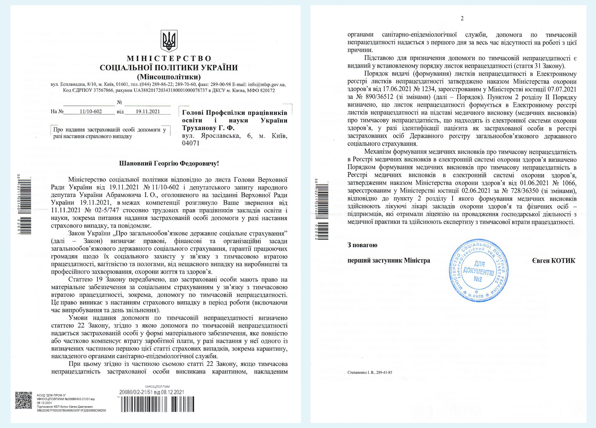 Мінсоцполітики відповідно до листа Голови ВР i депутатського запиту народного депутата України I.О. Абрамовича розглянуло звернення Профспілки працівників освіти і науки України від 11.11.2021 № 02-5/747 стосовно трудових прав працівників закладів освіти i науки, зокрема питання надання застрахованій особі допомоги у разі настання страхового випадку.