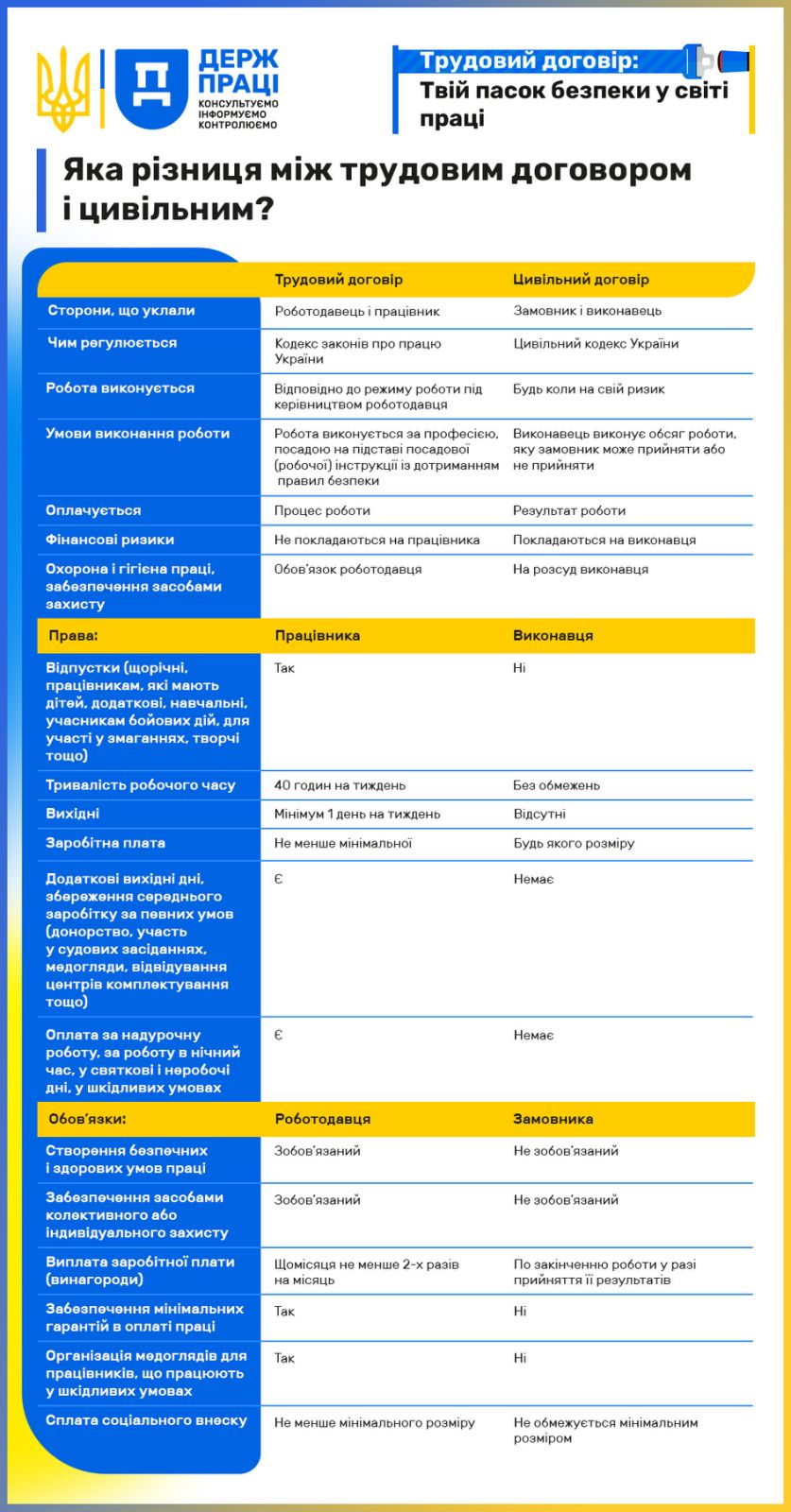 Цивільно-правовий договір передбачає наявність лише замовника та виконавця (ані працівників, ані роботодавців немає). У разі таких відносин на замовника не покладають відповідальність за умови праці, робоче місце, обладнання тощо.