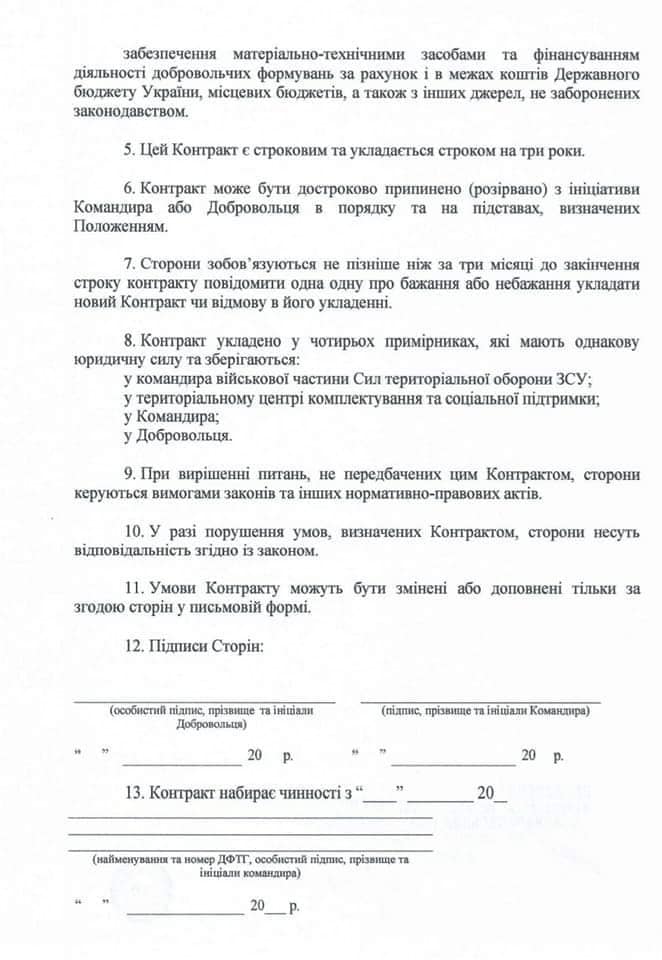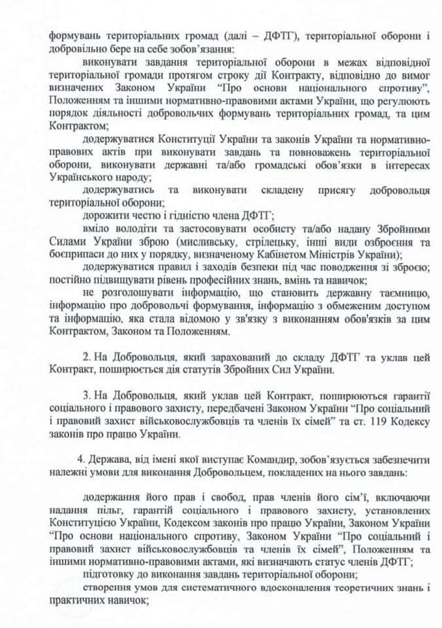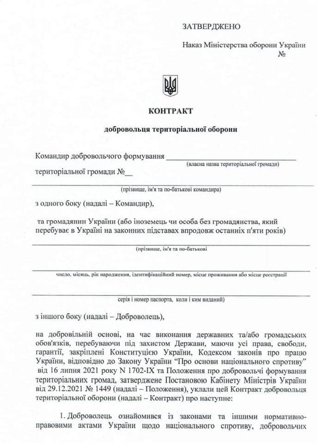 Форму контракту добровольця територіальної оборони виклав на своїй ФБ-сторінці експерт з питань обліку заробітної плати та інших розрахунків з персоналом Антон Янко.