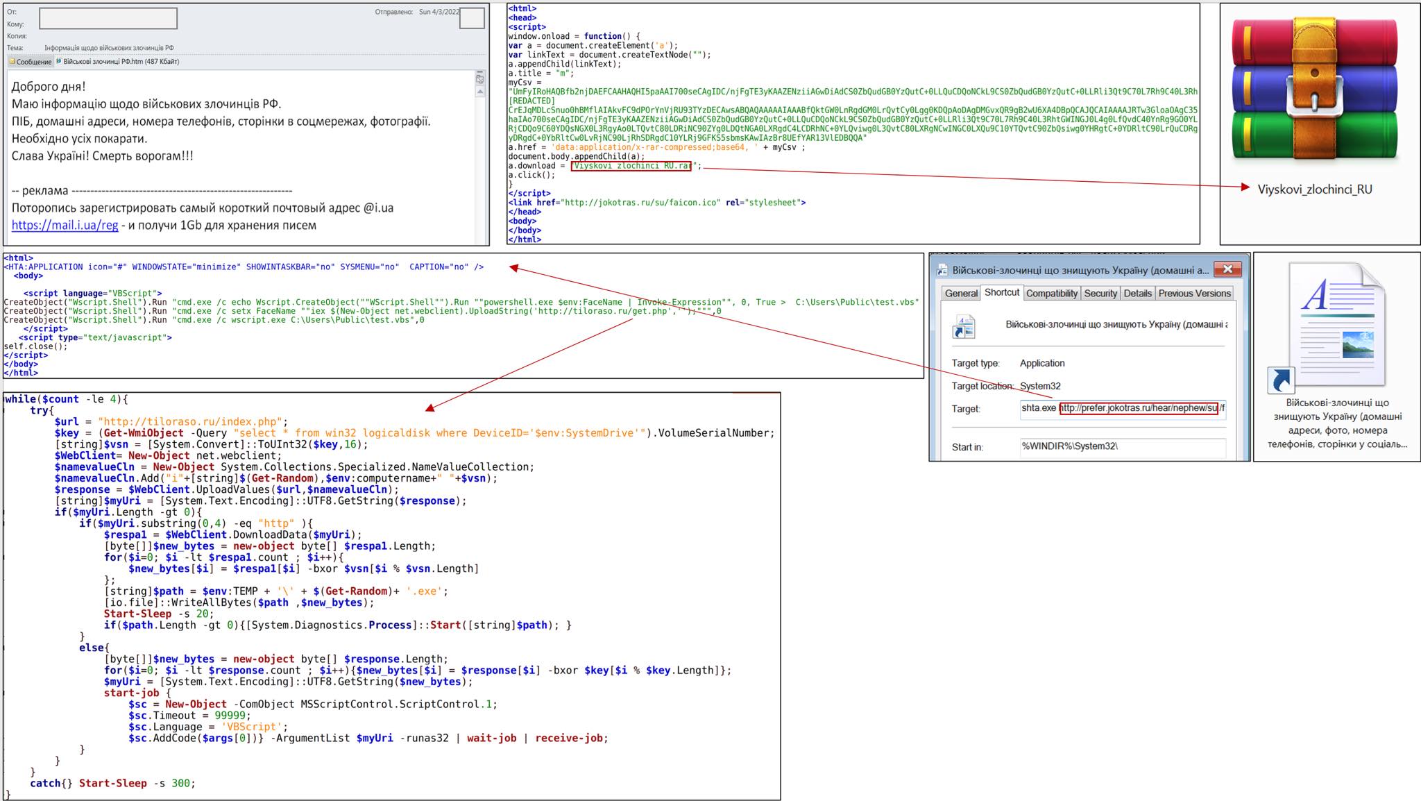 Електронний лист містить HTML-файл «Військові злочинці РФ.htm», відкриття якого призведе до створення на комп'ютері RAR-архіву «Viyskovi_zlochinci_RU.rar». Згаданий архів містить файл-ярлик «Військові-злочинці що знищують Україну (домашні адреси, фото, номера телефонів, сторінки у соціальних мережах).lnk». Його відкриття призведе до того, що зловмисники отримають віддалений доступ до комп'ютера жертви.