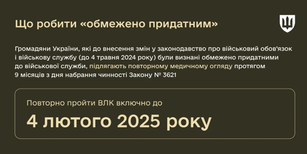 Громадяни України, яких до 4 травня 2024 року визнали обмежено придатними до військової служби, мають пройти повторний медогляд протягом 9 місяців з дня, коли Закон № 3621 набрав чинності, тобто до 4 лютого 2025 року включно.