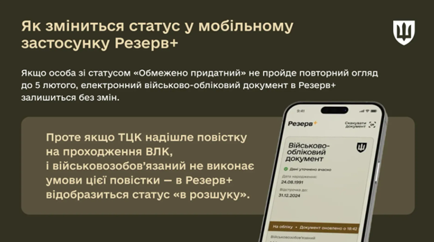 Якщо особа зі статусом «обмежено придатний» не пройде повторний медогляд до 4 лютого 2025 року, електронний військово-обліковий документ в Резерв+ залишиться без змін. Проте якщо ТЦК надішле повістку на проходження ВЛК, і військовозобов’язаний не виконає умови цієї повістки — в Резерв+ відобразиться статус «в розшуку».