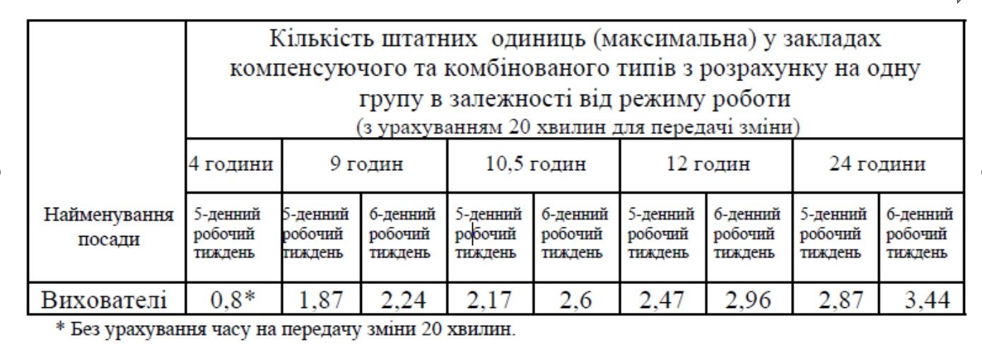 МОН рекомендує, допоки не внесли зміни до Типових штатних нормативів, при розрахунку кількості штатних одиниць посад вихователів на одну групу у ЗДО усіх типів керуватись розрахунком, що зазначений у листі МОН та ЦК Профспілки працівників освіти і науки України «Про застосування Типових штатних нормативів дошкільних навчальних закладів» від 18.02.2011 № 1/9-114, № 02-8/100 для ЗДО компенсуючого та комбінованого типів.