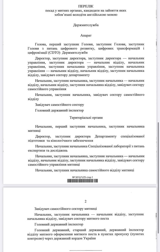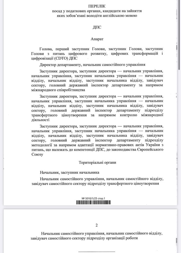 Нагадаємо, що Закон № 3760 діє з 27 червня 2024 р., окрім статусу англійської мови, він визначає категорії посад, кандидати на які зобов’язані володіти англійською мовою, серед яких працівники податкових та митних органів.